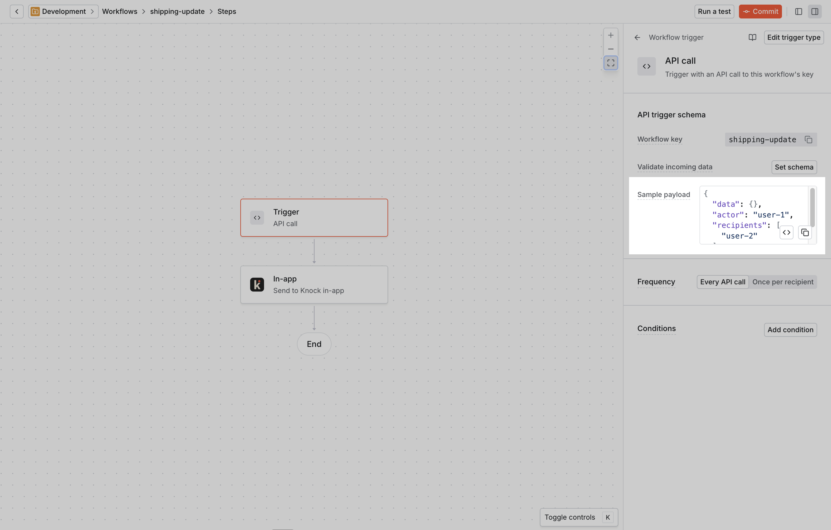 Before we leave the workflow canvas and head back to your backend, let’s click on the trigger step to grab a payload data sample to use when we call Knock.